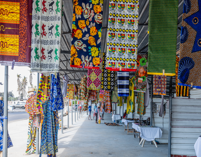 À Namibe, petite ville côtière où nous allons passer la nuit, il y a peu à découvrir, si ce n’est quelques marchands de tissus installés le long des rues.