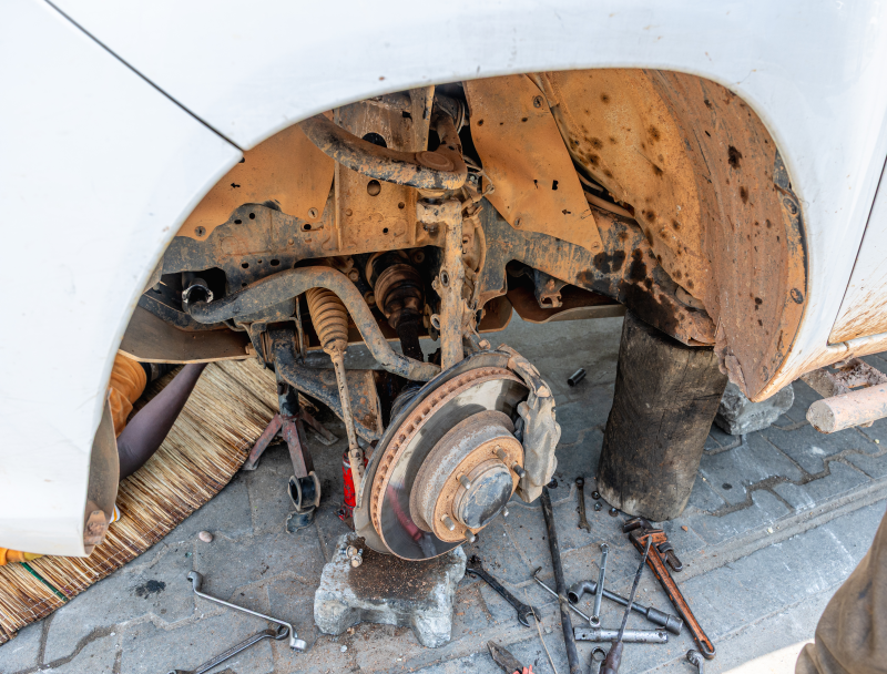 Depuis notre entrée au Nigeria, nous savions que notre amortisseur gauche était cassé. À Cotonou, il est temps d’intervenir.