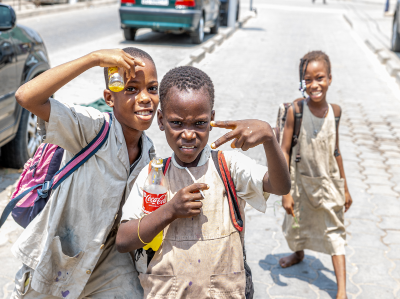 Des gamins défilent dans la rue, curieux et attirés par notre présence inhabituelle.