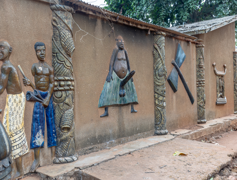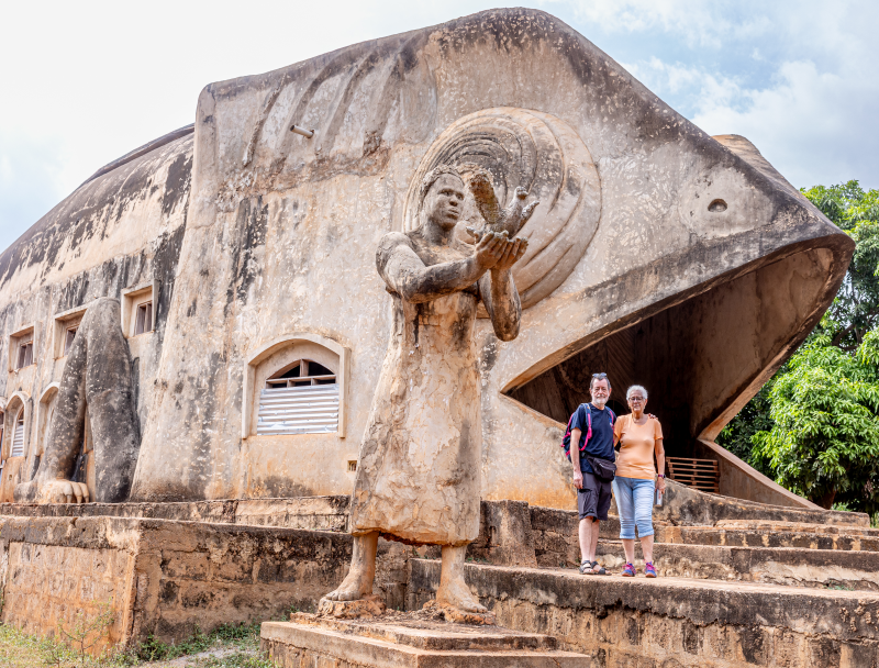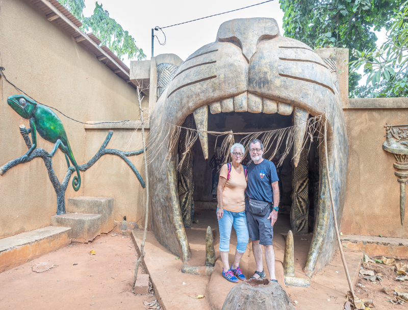 Après avoir déposé notre dossier pour obtenir le visa du Ghana, nous partons deux jours à Abomey, haut lieu du vaudou. Arrêt dans un camping pas très accueillant, plein de sculptures.