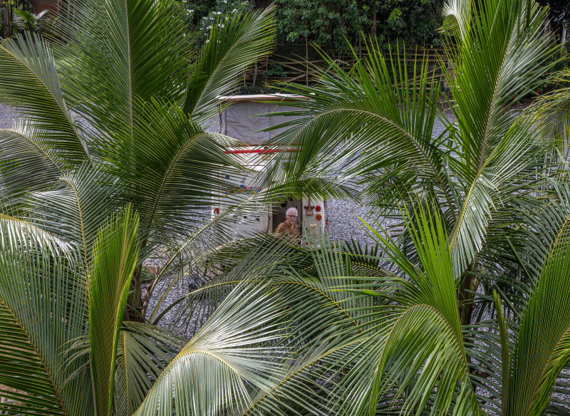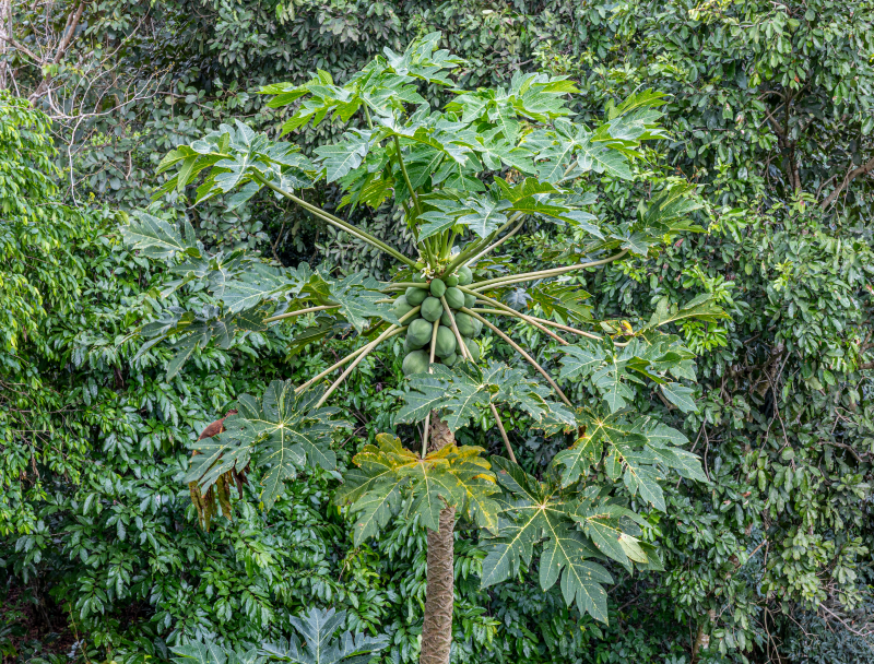 Au cœur d’une forêt luxuriante, des papayers chargés de fruits bordent notre refuge.