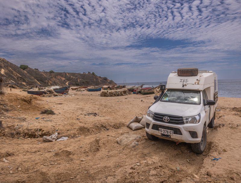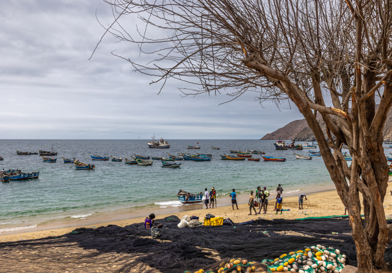 Le port de pêche de Lucira nous accueille pour une nuit paisible. Cette petite bourgade côtière vit au rythme de la mer : les barques colorées alignées sur la plage, les pêcheurs qui réparent leurs filets au coucher du soleil.