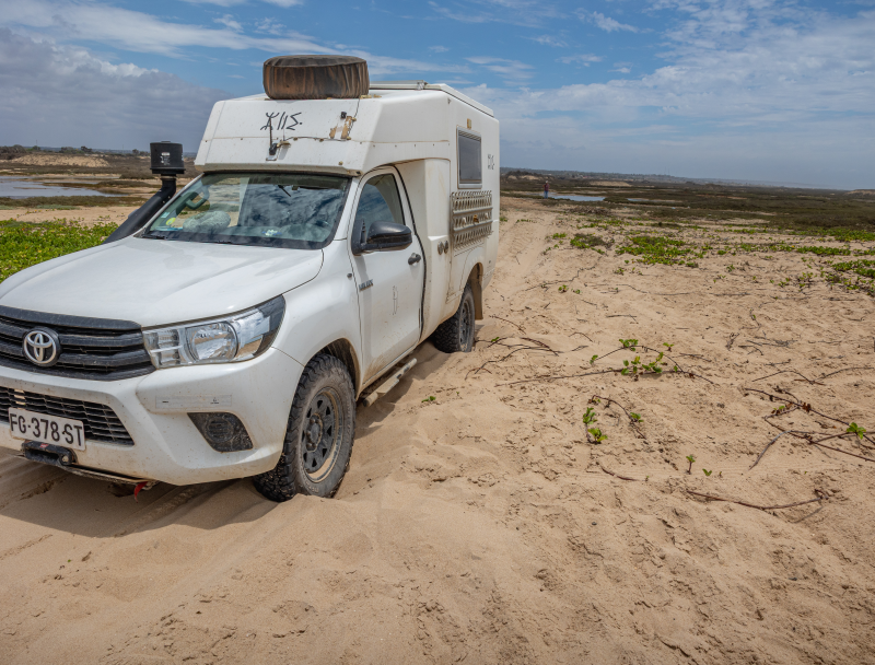 Avant d’arriver à Luanda, nous avons été attirés une dernière fois par la plage. Mais nos roues se sont enfoncées dans le sable mou, et le châssis est resté posé, immobilisé. Il nous a fallu pas moins d’une heure et demie d’efforts pour dégager le véhicule et nous tirer de là.