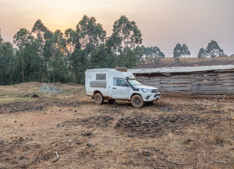 Premier bivouac au Nigeria, derrière une cabane qui nous dissimule de la route.