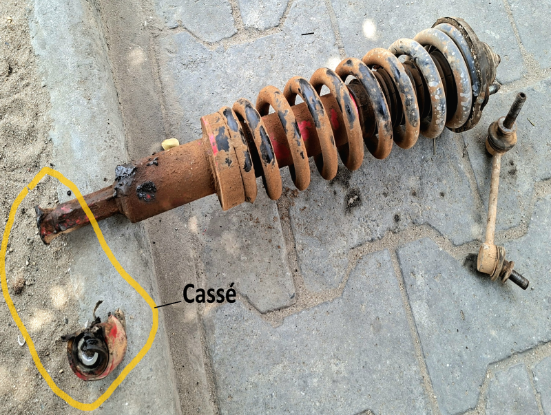 État du moyeu de fixation sur le triangle de suspension : difficilement ressoudable. Nous allons donc changer les deux amortisseurs avant.