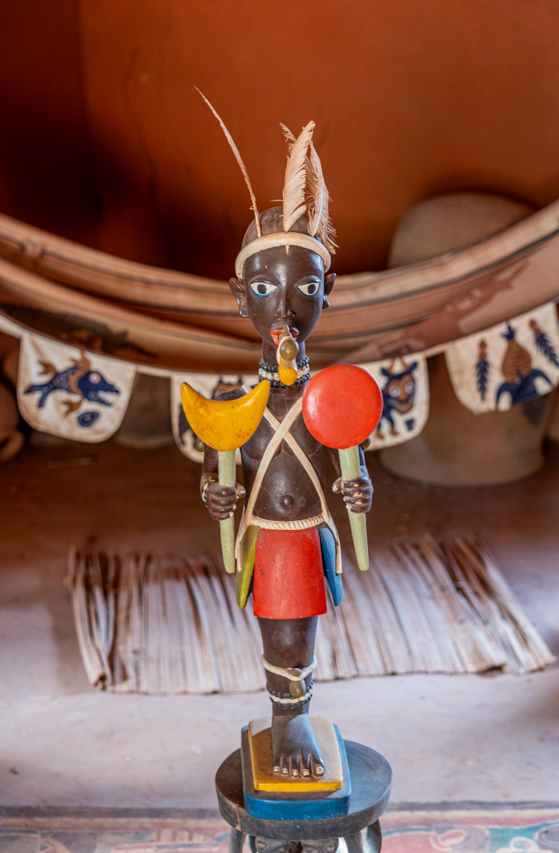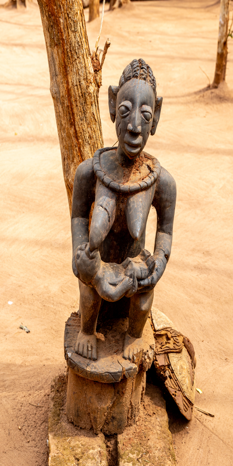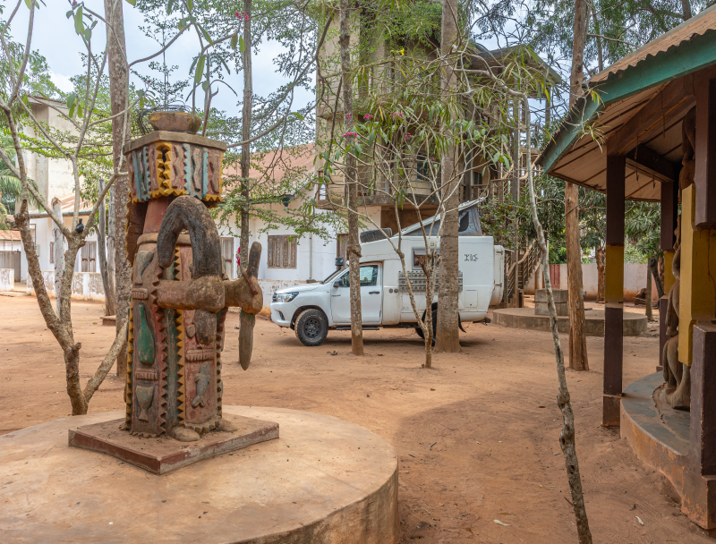 Après avoir déposé notre dossier pour obtenir le visa du Ghana, nous partons deux jours à Abomey, haut lieu du vaudou. Arrêt dans un camping pas très accueillant, plein de sculptures.